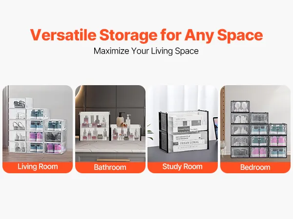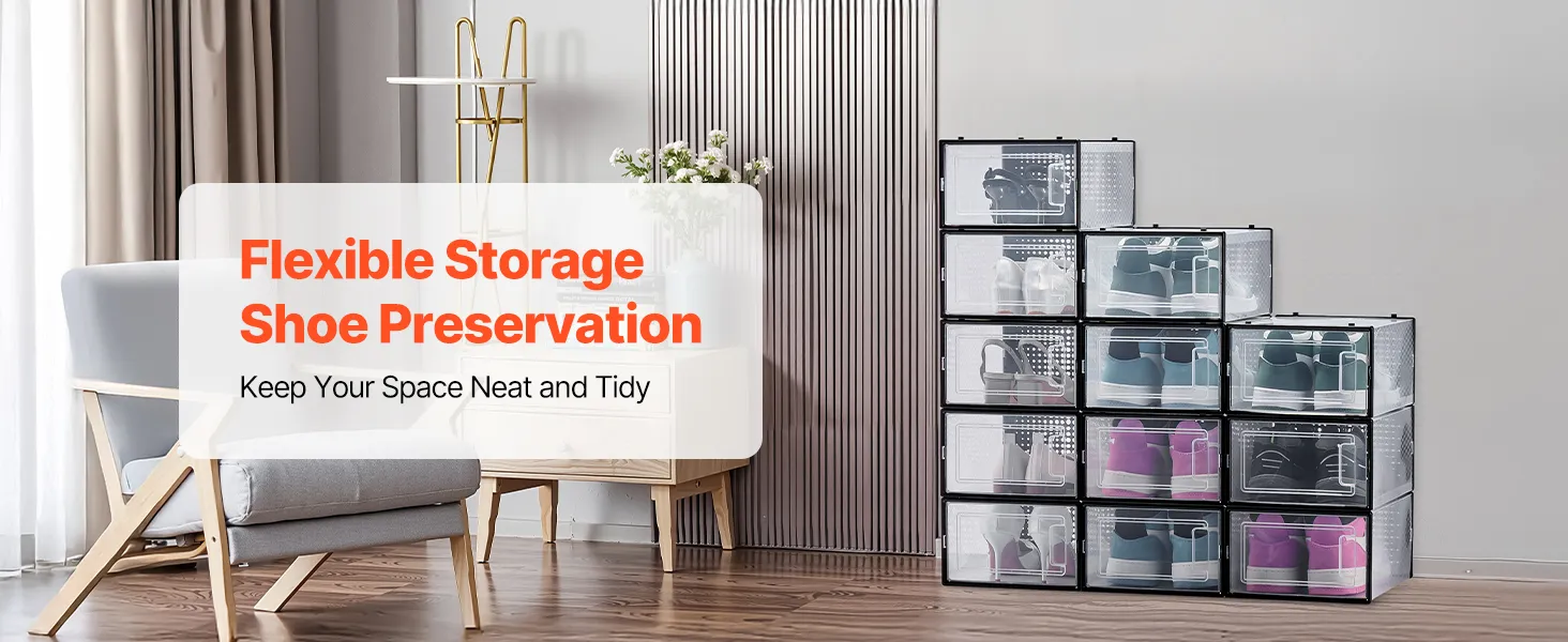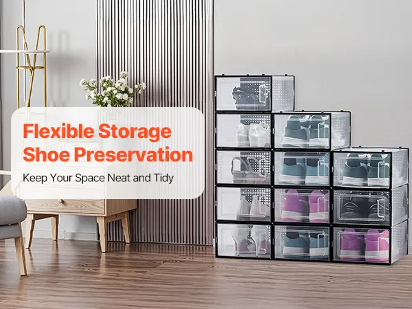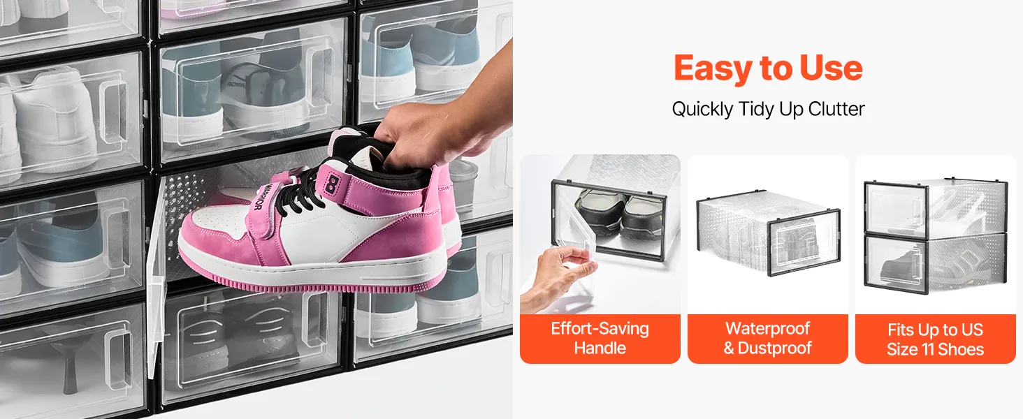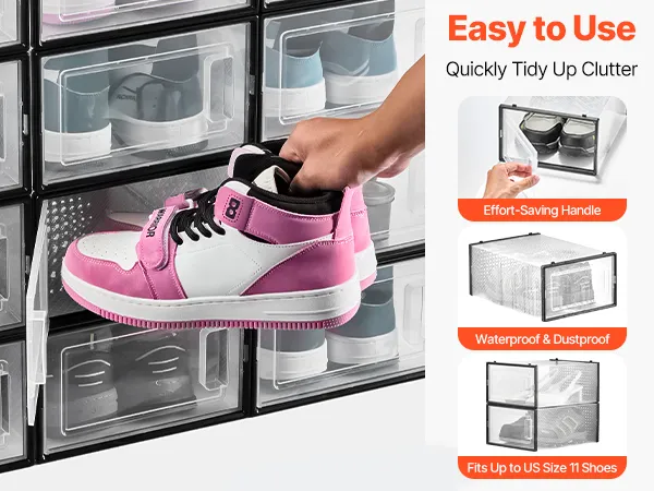 The convenient handle makes organization easy. These spacious shoe organizer boxes fit up to US Size 11 shoes and feature water-proof and dust-proof designs, providing maximum care for your favorite footwear.