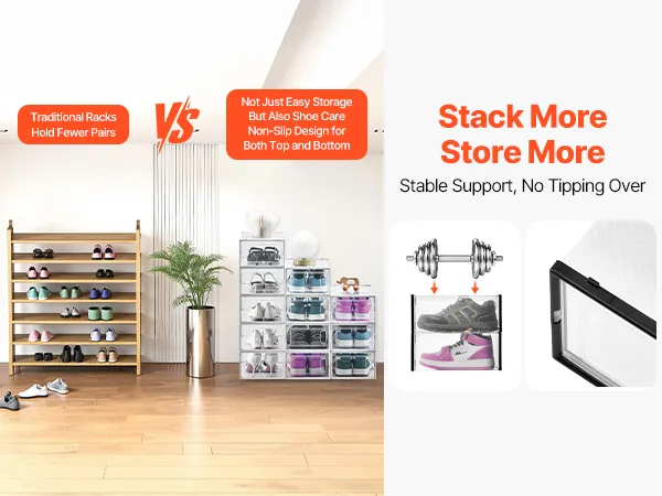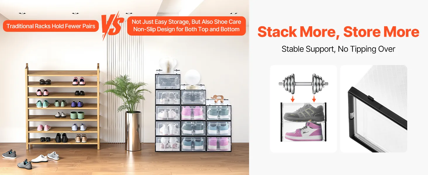 Clear shoe boxes store more shoes and small items while ensuring stability with strong load-bearing support and non-slip design, providing a secure storage solution for your footwear.