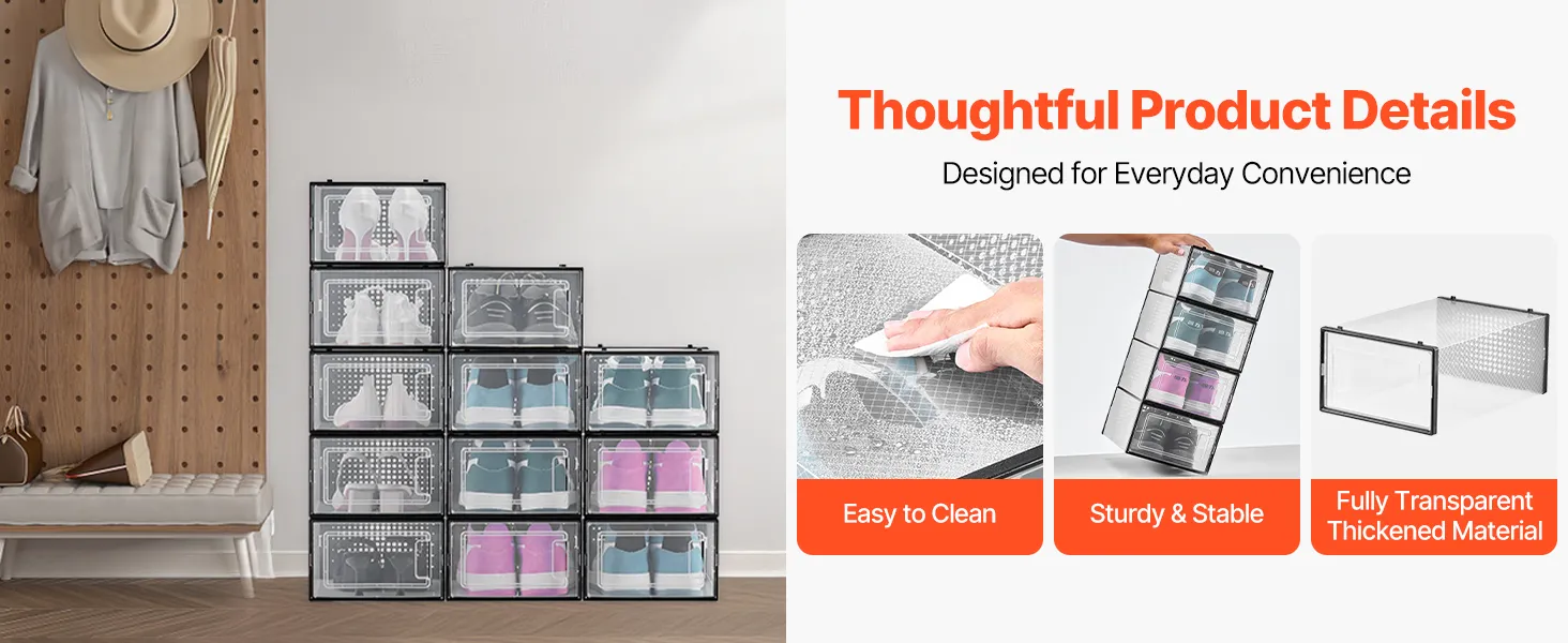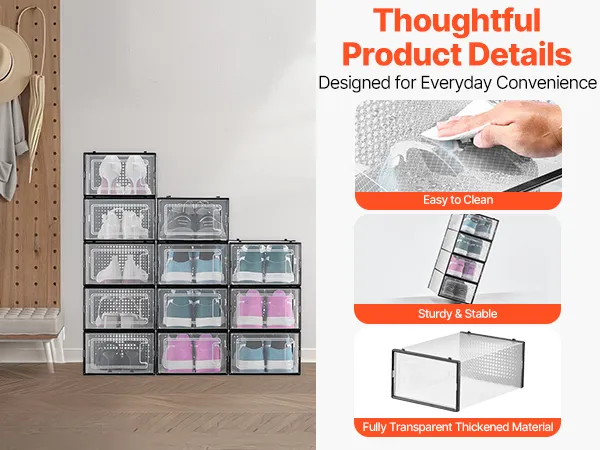 Sturdy Thickened Construction: Our shoe storage boxes are made of upgraded PP/PS on all six sides, providing superior strength for stacking multiple boxes without warping or cracking. The clip-lock front door design makes it easy to access your shoes