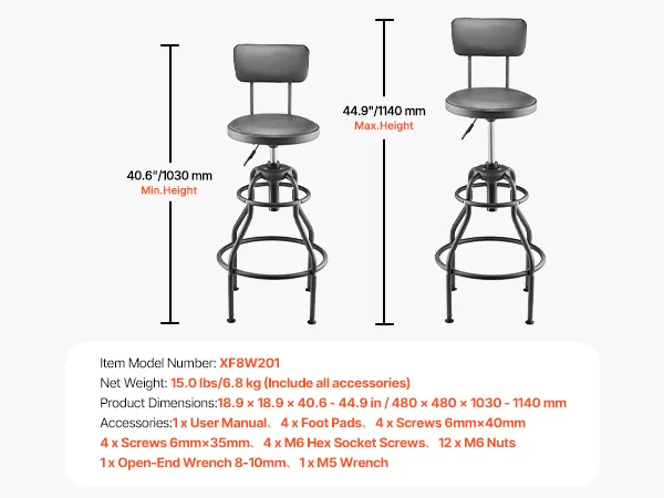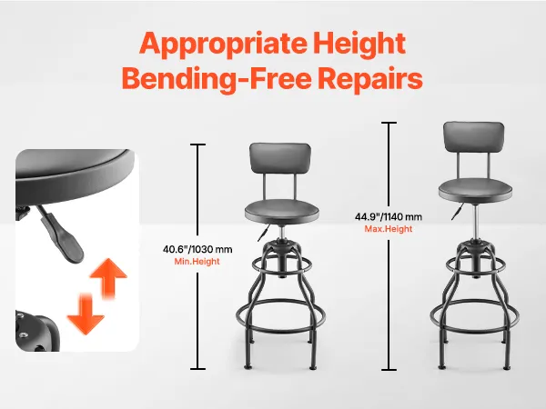 Adjustable Height: You can adjust the height of the shop stool between 40.6-44.9 in / 1030-1140 mm (seat height from the ground) using the pneumatic cylinder, allowing you to find the ideal height for your work, so you no longer have to bend or hunch over!