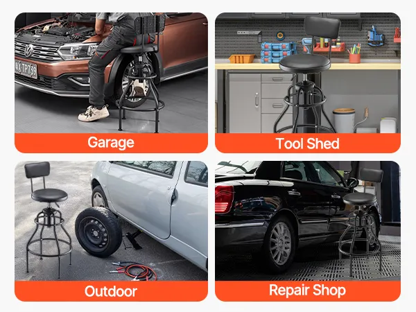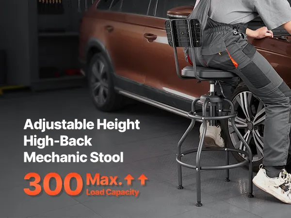 300 lbs Weight Capacity: Built with a heavy-duty carbon steel frame and reinforced screws, this garage stool supports up to 300 lbs and maintains its shape over long-term use. The stable center of gravity ensures it remains upright and helps avoid tipping.