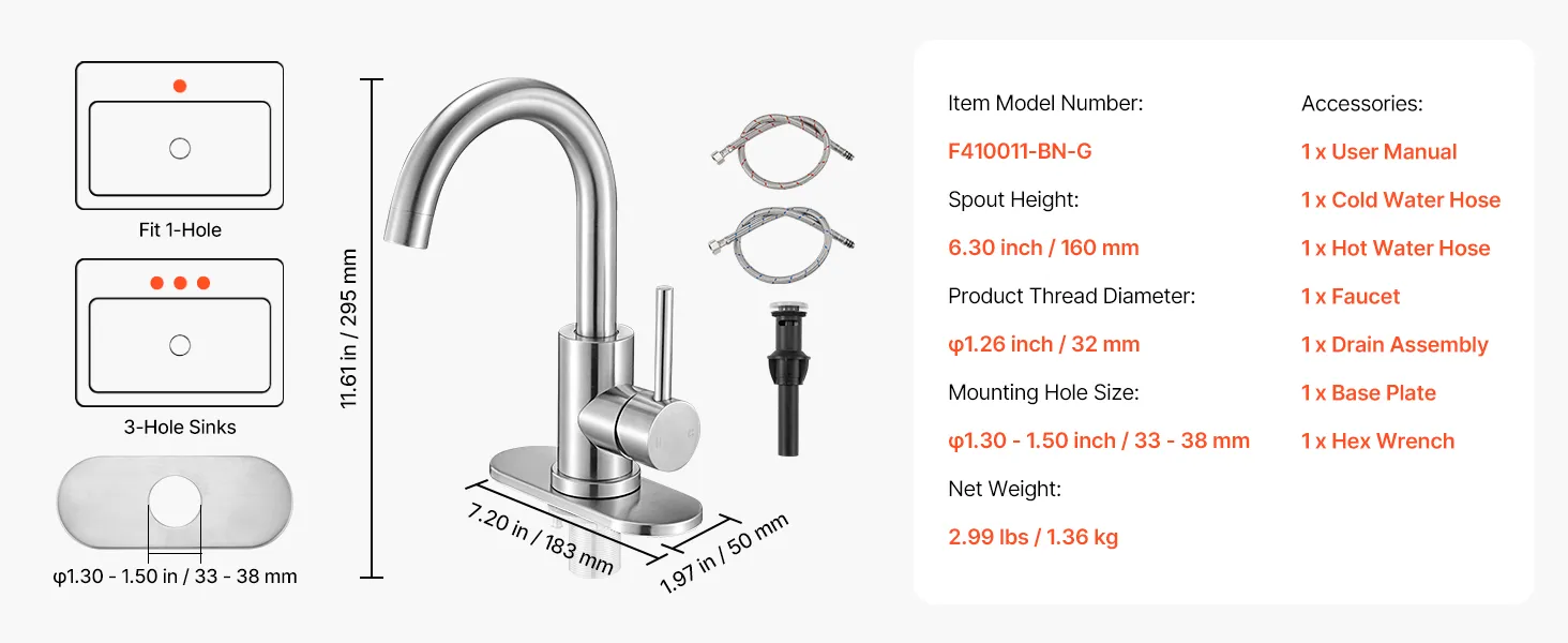 This VEVOR single handle bathroom faucet features a high spout, reducing bending and making it easier for expectant mothers to use. It also expands the cleaning area, allowing you to clean large trays or pots without flipping them, minimizing splashes and keeping your countertop dry.