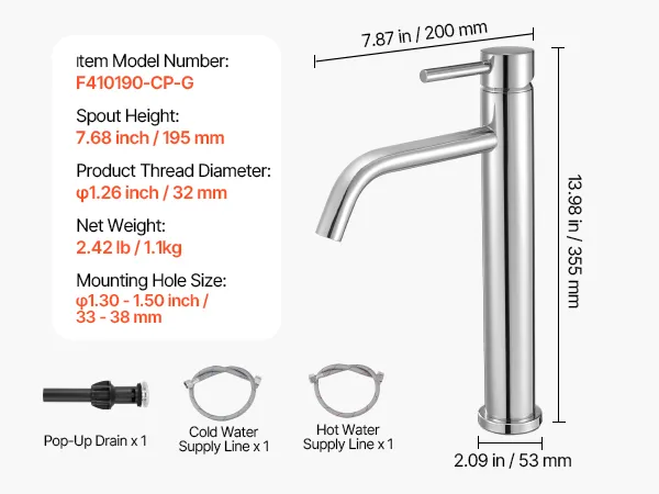 Made with 304 stainless steel and a braided hose, this single handle sink faucet offers rust and leak resistance. The single handle allows easy control of temperature and flow, while the press-to-open drain ensures smooth operation. Includes all necessary parts for hassle-free installation.