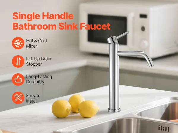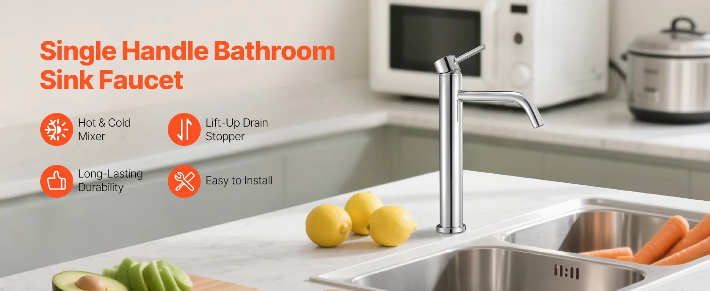 VEVOR Single Handle Sink Faucet, Chrome-Plated Silver Faucet Kitchen Sink, 1 or 3 Hole Kitchen Water Faucets with Push-Button Drain, Suitable for Bathroom, RV, Bar, Public Restroom, High Arc Faucets