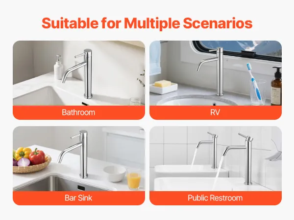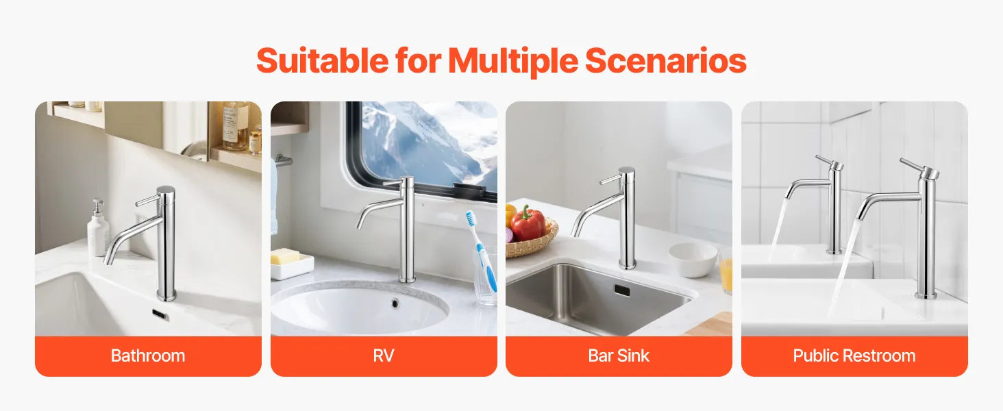 Designed for multiple environments, this stainless steel faucet for kitchen sink is suitable for bathrooms, RVs, bars, and public places. It meets diverse water usage needs, offering efficient and dependable water flow in various spaces.
