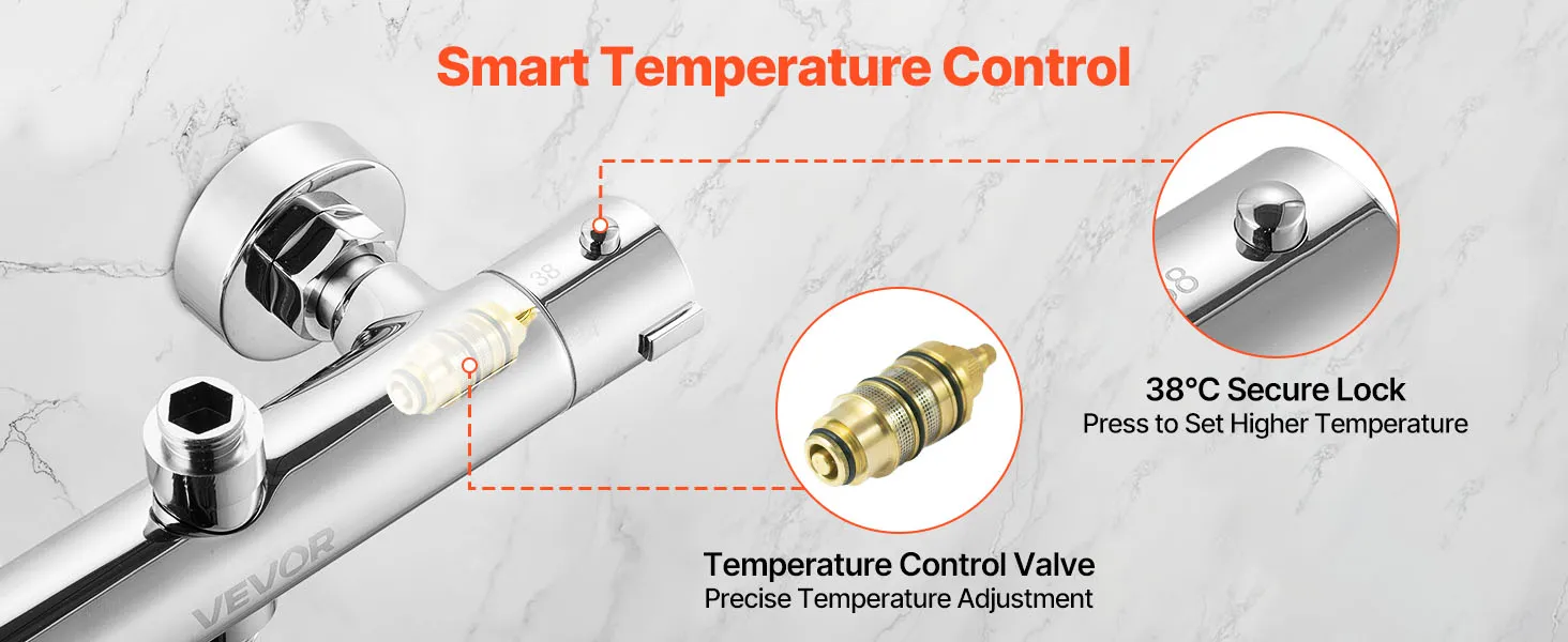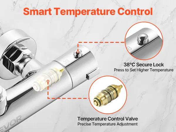 Anti-Scald Secure Lock: Our thermostatic shower valve features a 38℃ lock for instant comfort. No need to keep adjusting water temperature. Press and turn to raise heat, reducing burn risks and supporting gentle showers for children and elderly family members