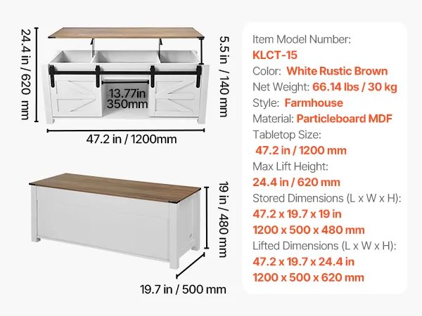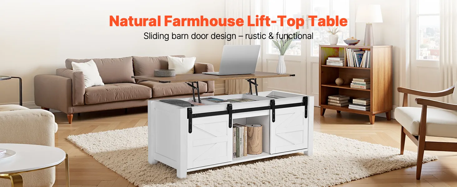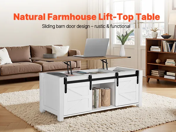 VEVOR 1200 mm Farmhouse Lift Top Coffee Table, Rustic Center Table with Barn Door and Hidden Storage Compartment, Modern Rectangle Lifting Tabletop for Living Room, Office, Home, Easy Assembly, White