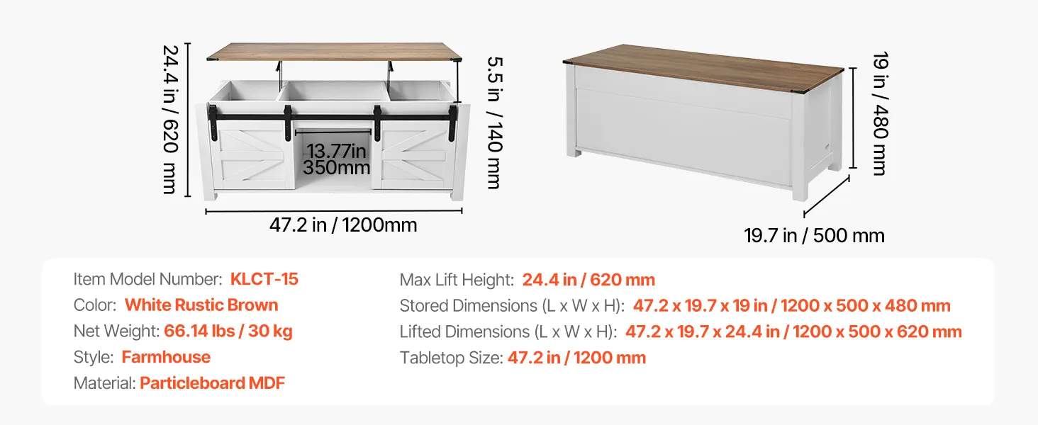 Spacious Storage Space: Includes 2 hidden compartments beneath the tabletop and 1 open shelf, ideal for storing everyday essentials. The sliding barn door adds both function and farmhouse flair. Paired with a spacious 47.2 in / 1200 mm tabletop, there's plenty of room for your laptop, books, and coffee mug