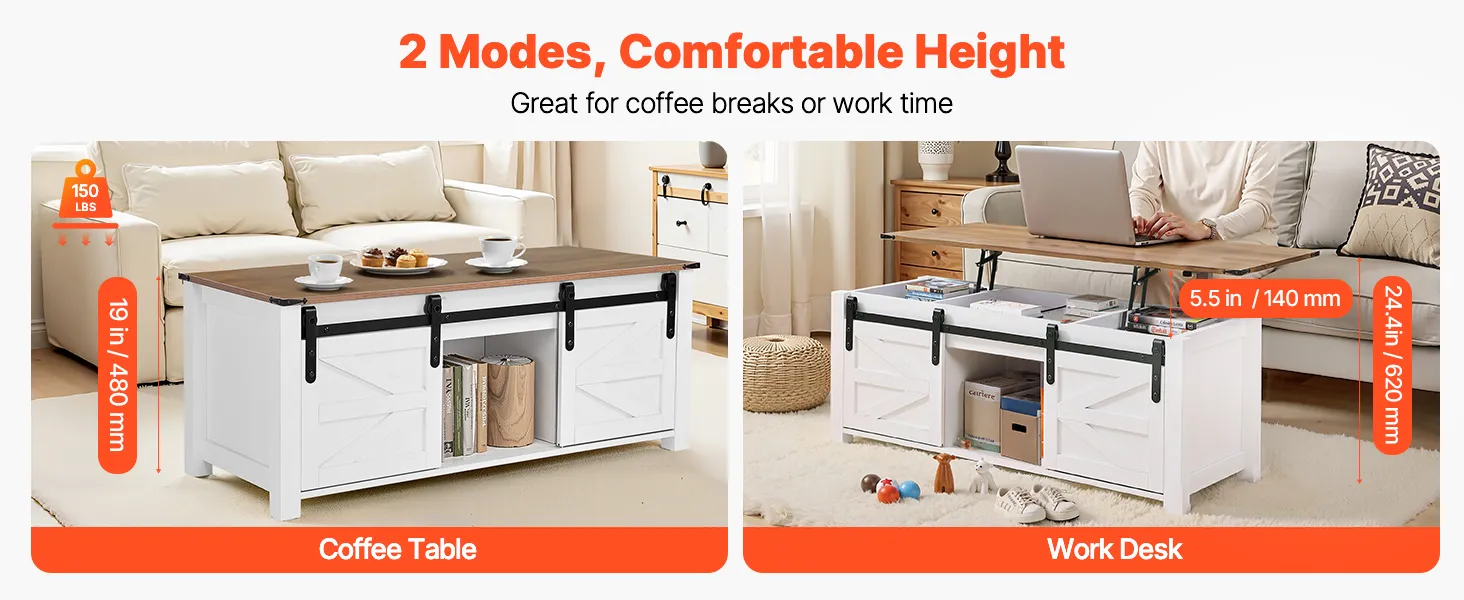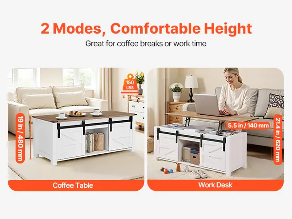 All-in-One Versatility: Instantly switch from lounging to working—space-saving, efficient, and designed for modern multitasking. The lift top coffee table can rise up to 24.4 in / 620 mm, reaching the ideal height for working without strain