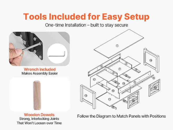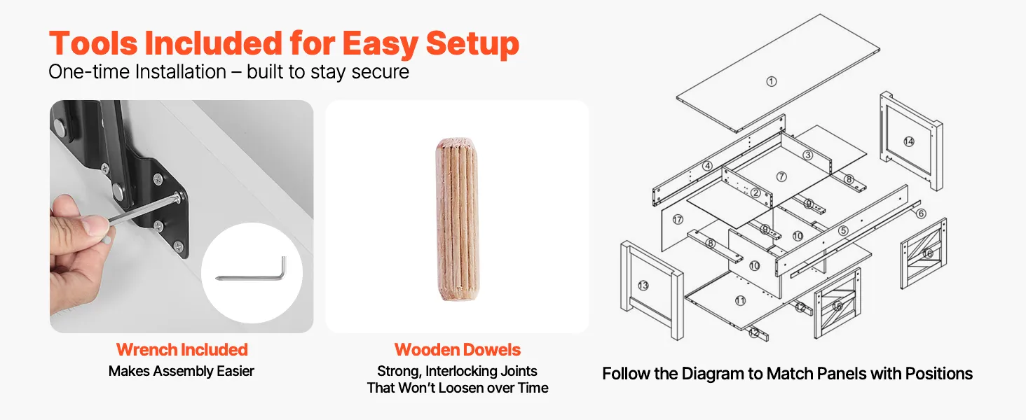 We include all necessary hardware for a hassle-free setup—plus a handy wrench and wood dowels to ensure solid, long-lasting assembly from the very first installation.