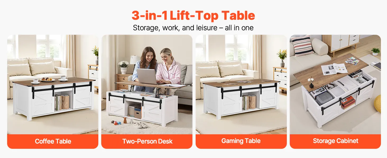 Easily transition between leisure, work, and storage. Use it as a traditional coffee table or storage cabinet, or lift the top to turn it into a spacious dual-person workstation—ideal for shared use in the living room or home office.