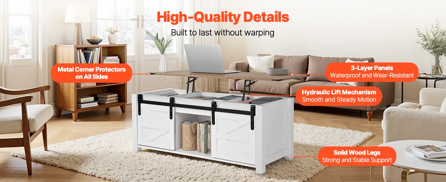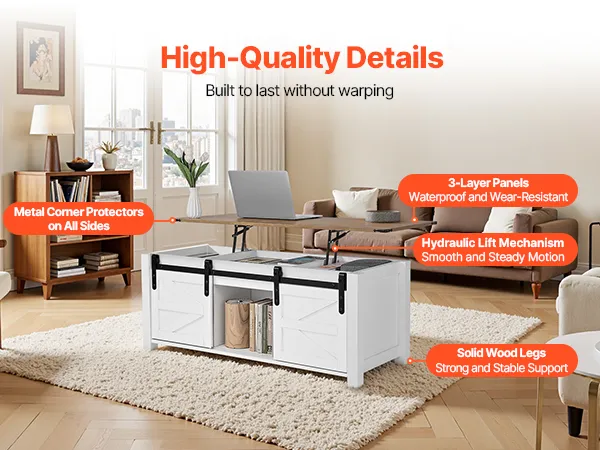 Three-Layer Construction: The wooden coffee tabletop surface is built with a MDF base and particle board core, reinforced for strength and resistance to bending. The top layer features a melamine veneer that’s waterproof, scratch-resistant, and easy to clean with just a quick wipe