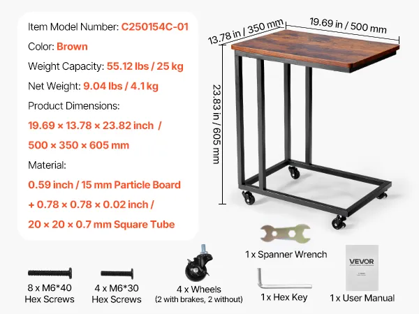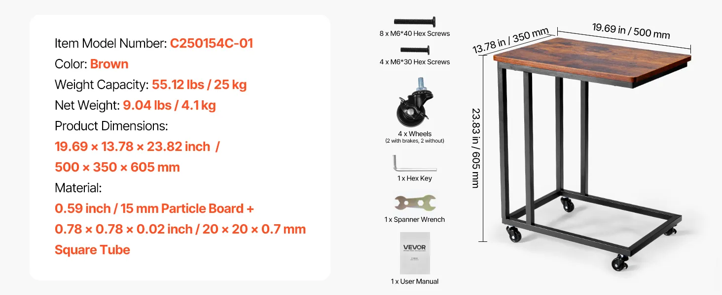 Sized 19.69 x 13.78 x 23.82 inch (500 x 350 x 605mm), this C-shaped table slides under sofas or beds for smart storage. Four 360° wheels ensure easy mobility. The sturdy metal frame and thick particle board support up to 55.12 lbs. Quick assembly makes it ideal for living rooms or bedrooms.