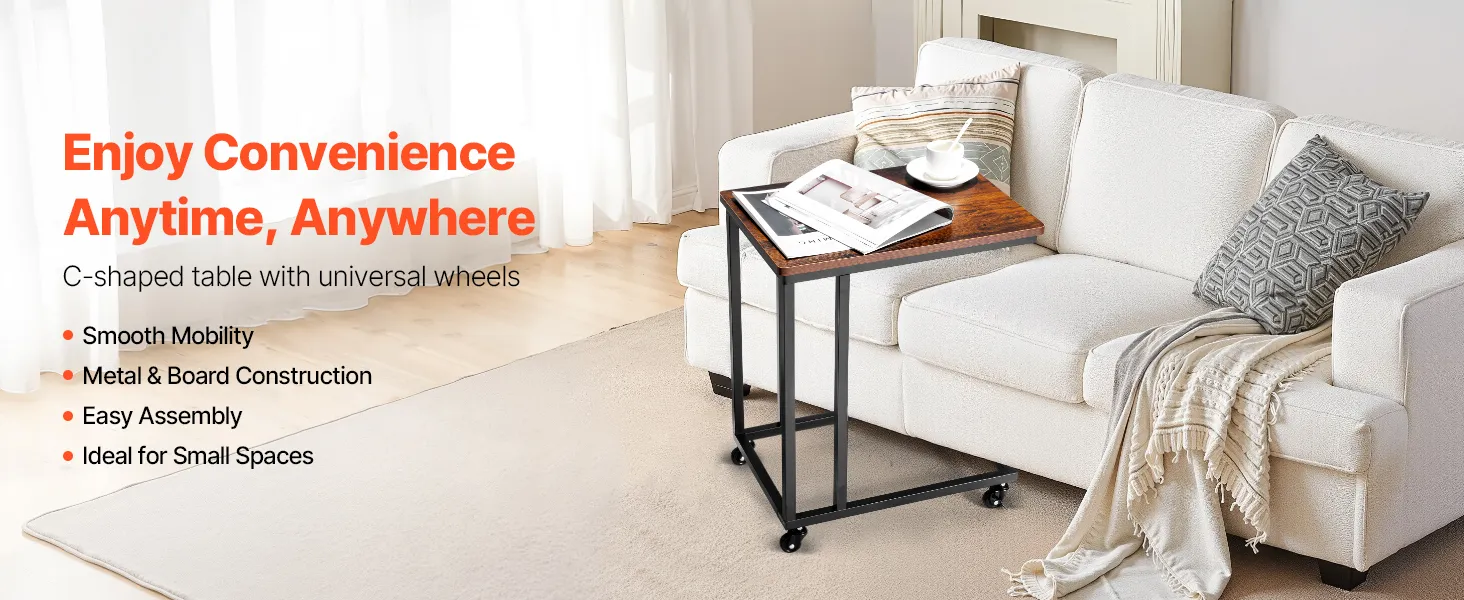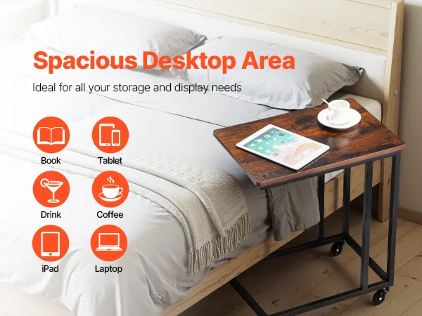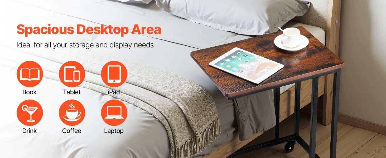 This c table with wheels offers a wide tabletop that easily holds books, tablets, iPads, drinks, coffee, or laptops. Whether you're relaxing on the sofa or working in bed, the generous surface gives you room for everything you need, keeping essentials within reach.