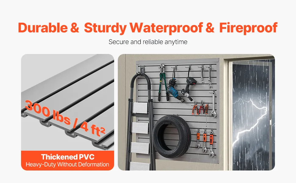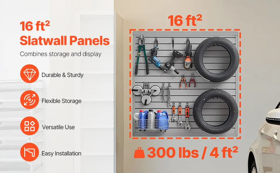 • Strong Load-Bearing Capacity: The slat wall panel can support up to 300LBS/4ft², providing stable and efficient storage for various heavy items such as hammers, drills, ladders, and more, making it ideal for use in garages, workshops, and other spaces.