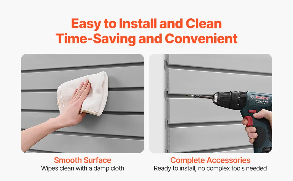 The smooth PVC surface on the slat wall panel is easy to clean. It requires just a quick wipe to dispel dust. The slatwall’s installation is simple with complete accessories, so you can quickly set it up yourself.