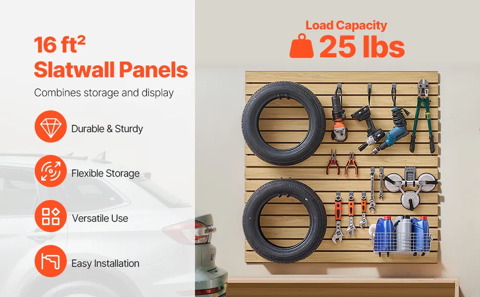 • Strong Load-Bearing Capacity: The slat wall panel can support up to 25 lbs, providing stable and efficient storage for various heavy items such as hammers, drills, ladders, and more, making it ideal for use in garages, workshops, and other spaces.