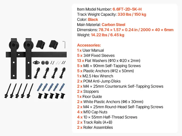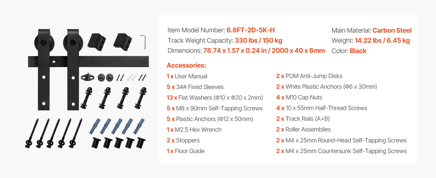 Durable and Sturdy: Made from heavy-duty carbon steel, this barn door hardware kit can hold up to 330lbs / 150kg, avoiding bending or warping. The black powder-coated finish is damp-proof and won't rust or chip.