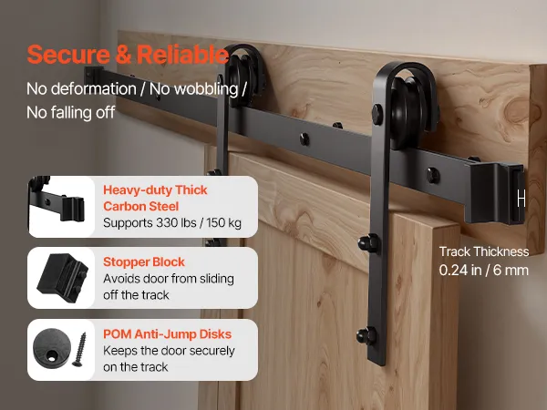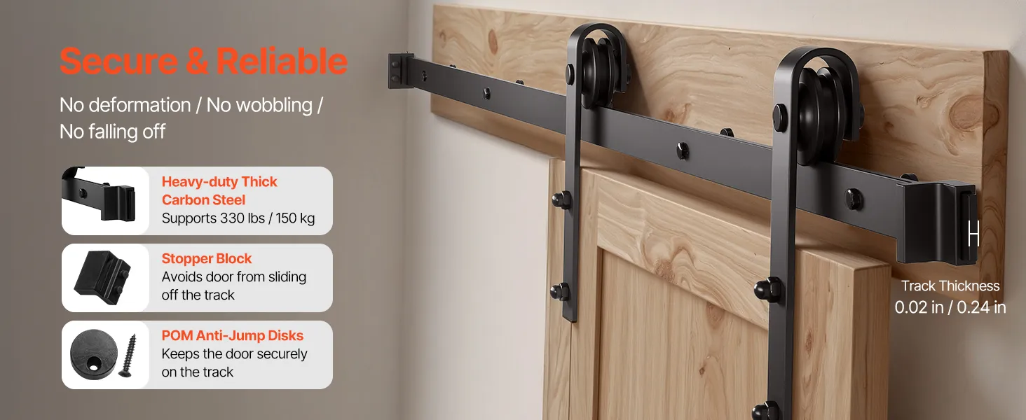 Crafted from thick, heavy-duty carbon steel, this barn door track supports your doors without bending or warping. With limit blocks and POM anti-jump pieces, you won’t have to worry about the door slipping off or bouncing around – keeping your space secure!