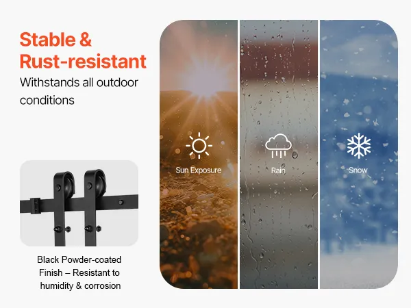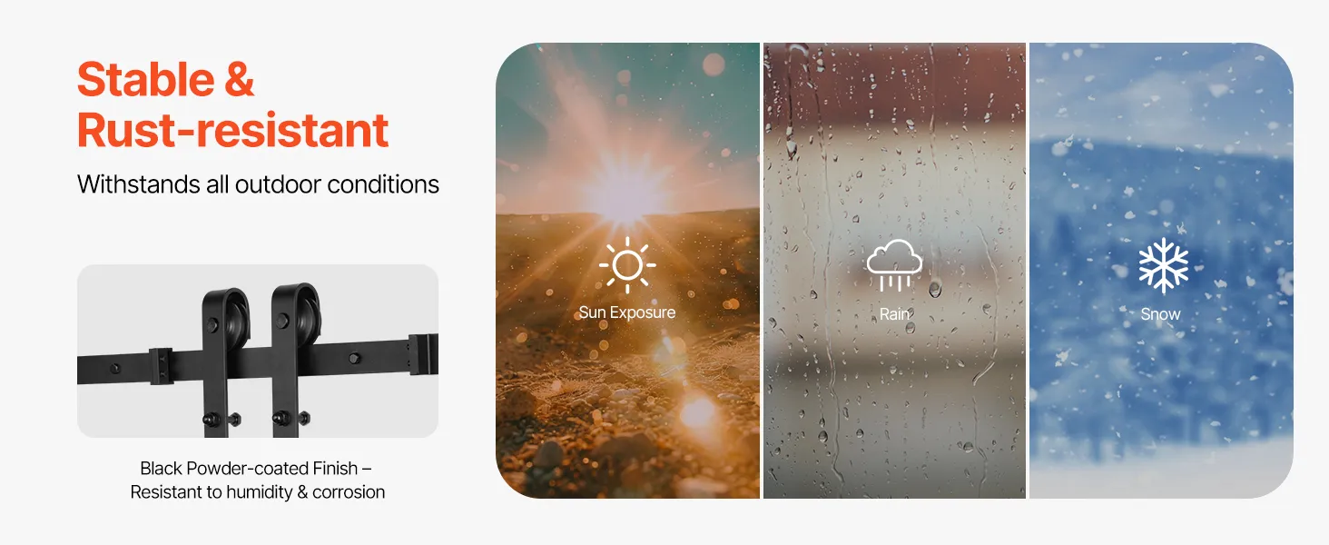 Featuring a tough black powder finish, this sliding barn door hardware kit is damp-proof, rustproof, and built to handle any weather – rain, shine, or snow. It keeps your doors looking great without the need for constant upkeep.