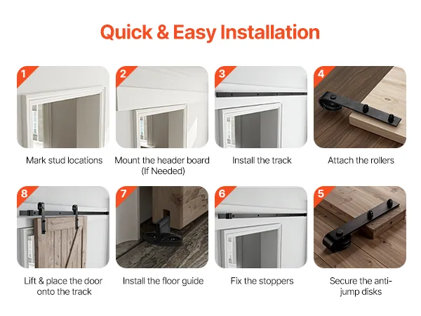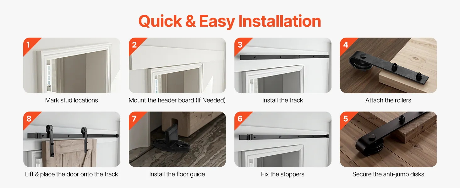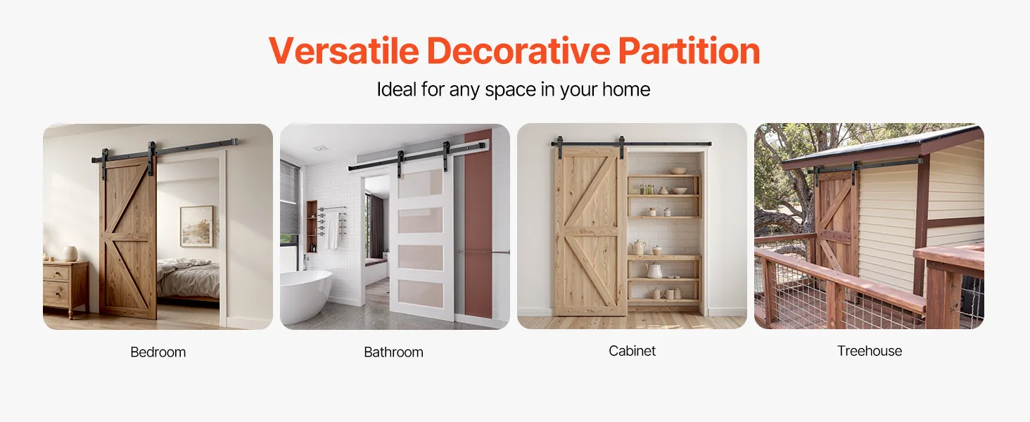 Smooth and Quiet: Equipped with high-density thermoplastic wheels and excellent bearings, the sliding barn door operates smoothly and quietly, ensuring no disruption to your peace.