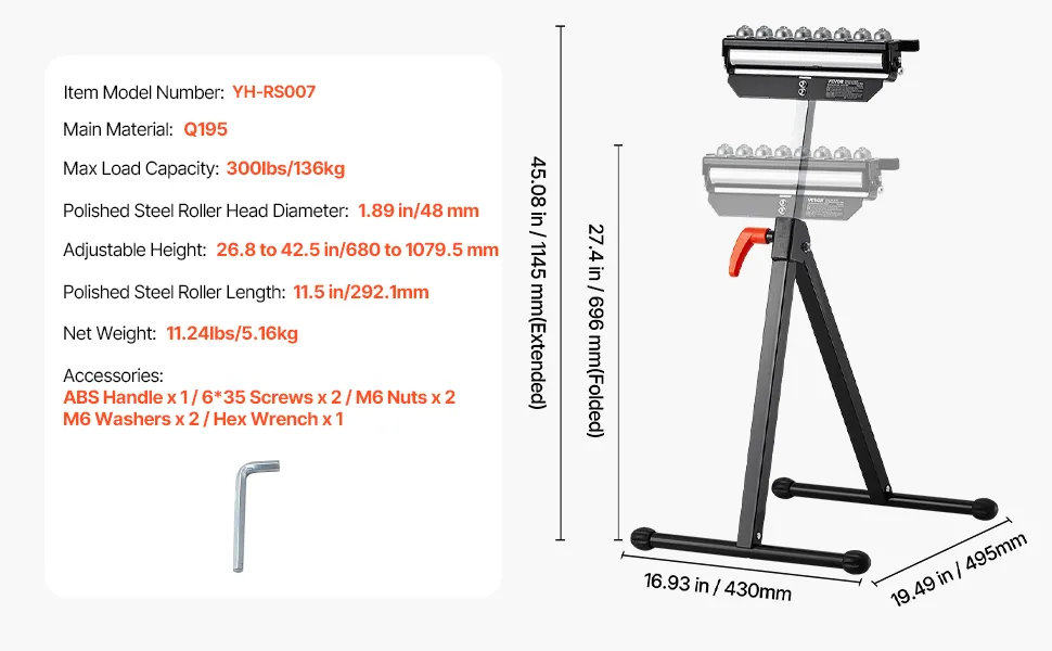 The Q195 roller stands feature triangular structure that provides solid support with max load capacity of 300 lb. The built-in telescoping bar allows flexible height adjustment from 26.8 to 42.5 in. The 3-in-1 roller ball design offers ball support, roller support and stationary support.