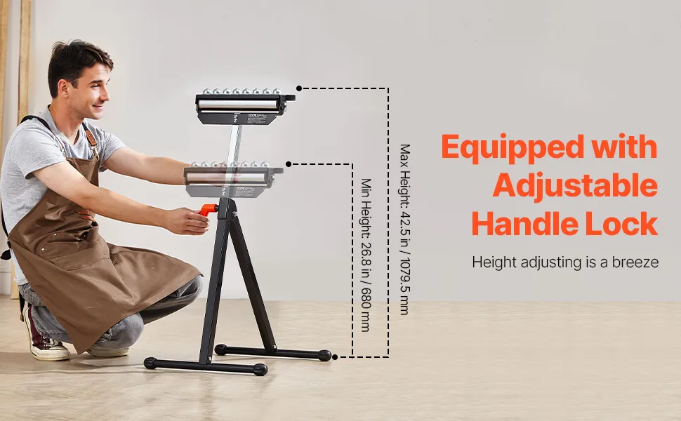 The table saw roller stand is equipped with an ABS adjustment handle lock, allowing you to easily twist the lock to adjust the stand height from 26.8-42.5 in as needed, ensuring flexibility during use. It is user-friendly, making it easy for both new and experienced users to operate.