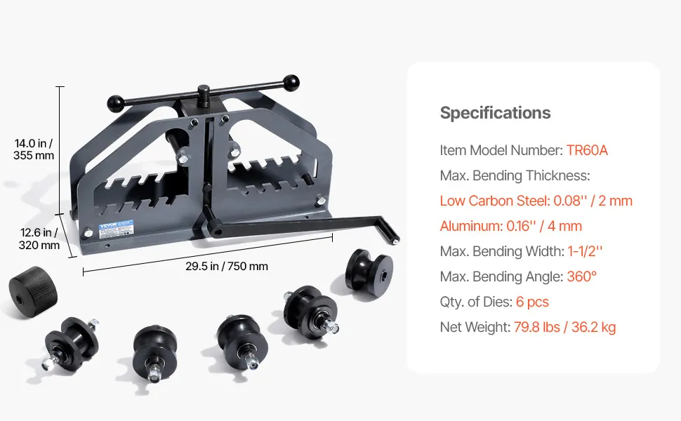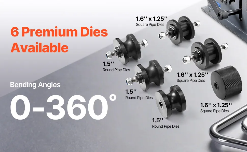 VEVOR tube roller bender combines exceptional bending capability with durable construction, making it an essential tool for metalworking projects. It can bend pipes up to 1-1/2" wide with a maximum bending angle of 360°, and comes with 6 premium dies, ensuring high bending efficiency and quality.