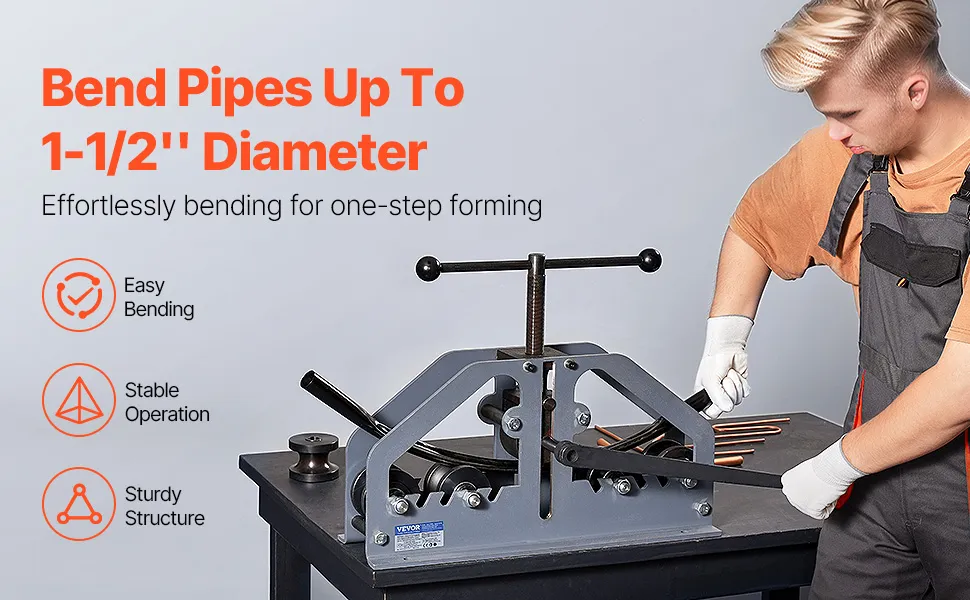 Exceptional Bending Capability: VEVOR tube roll bender handles pipes of up to 1-1/2'' diameters, smoothly bending low-carbon steel under 0.08'' thick and aluminum under 0.16'' thick, with a maximum bending angle of 360-degree to meet diverse bending needs.
