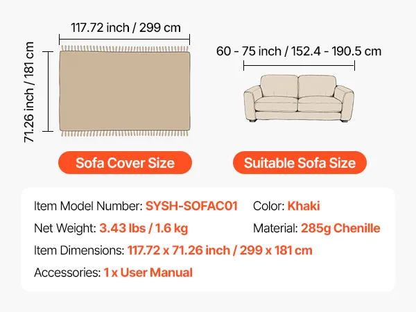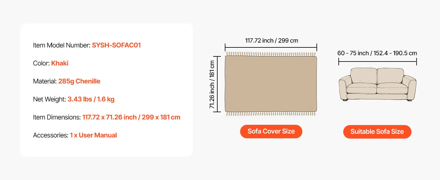 Full Coverage Protection: Want to keep your sofa from daily wear, stains, and pet scratches? Refresh your home with our chenille couch cover! It provides full coverage and all-around protection. Measuring 117.72 x 71.26 inch / 299 x 181 cm, it's suitable for sofas between 60–75 inch of various shapes. Please measure before purchasing