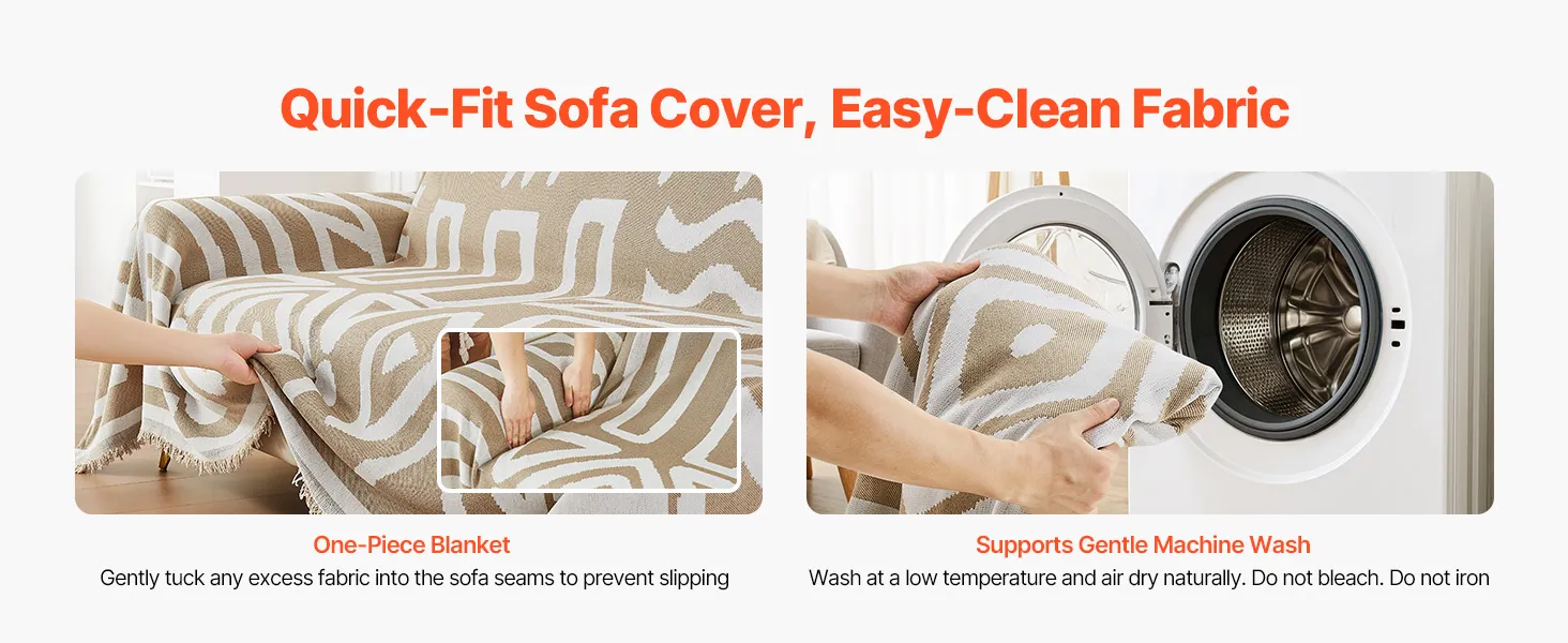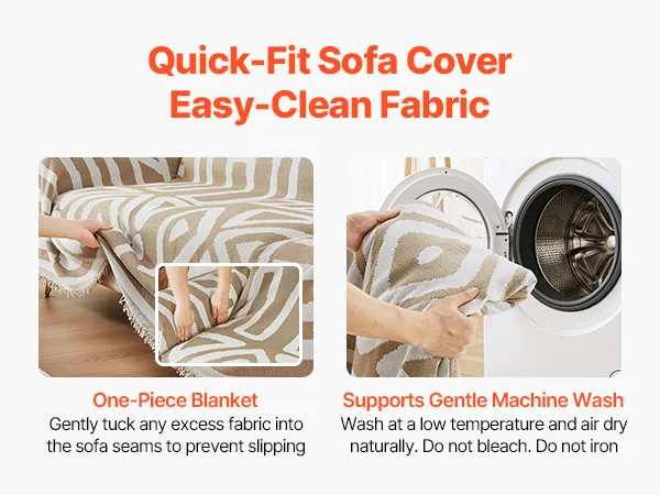 This one-piece farmhouse couch cover fits sofas of various shapes. Simply drape it over and adjust into place. When dirty, remove and machine wash with mild detergent on a low-temperature setting. It is not easy to deform, shrink, or fade.
