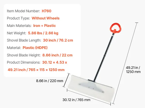 • Widened Shovel Blade: Featuring a 30 in (76.2 cm) wide blade with a height of 8.66" (22 cm), this snow pusher clears larger areas in one go, boosting efficiency. The reversible blade design easily breaks through snow and ice, making winter snow removal faster and less tiring