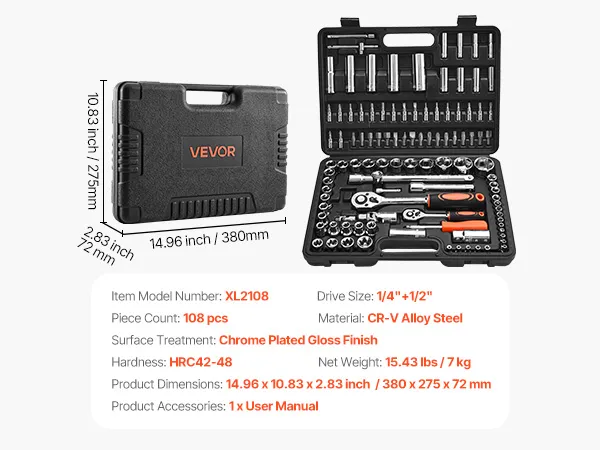 VEVOR Socket Set, 108 Pieces, 6.4 & 12.7 mm Drive Socket and Ratchet Set, Metric Size from 4 to 32 mm, Mechanic Tool Kit with Bits, Accessories, Storage Case, CR-V Alloy Steel, for Automotive Repair