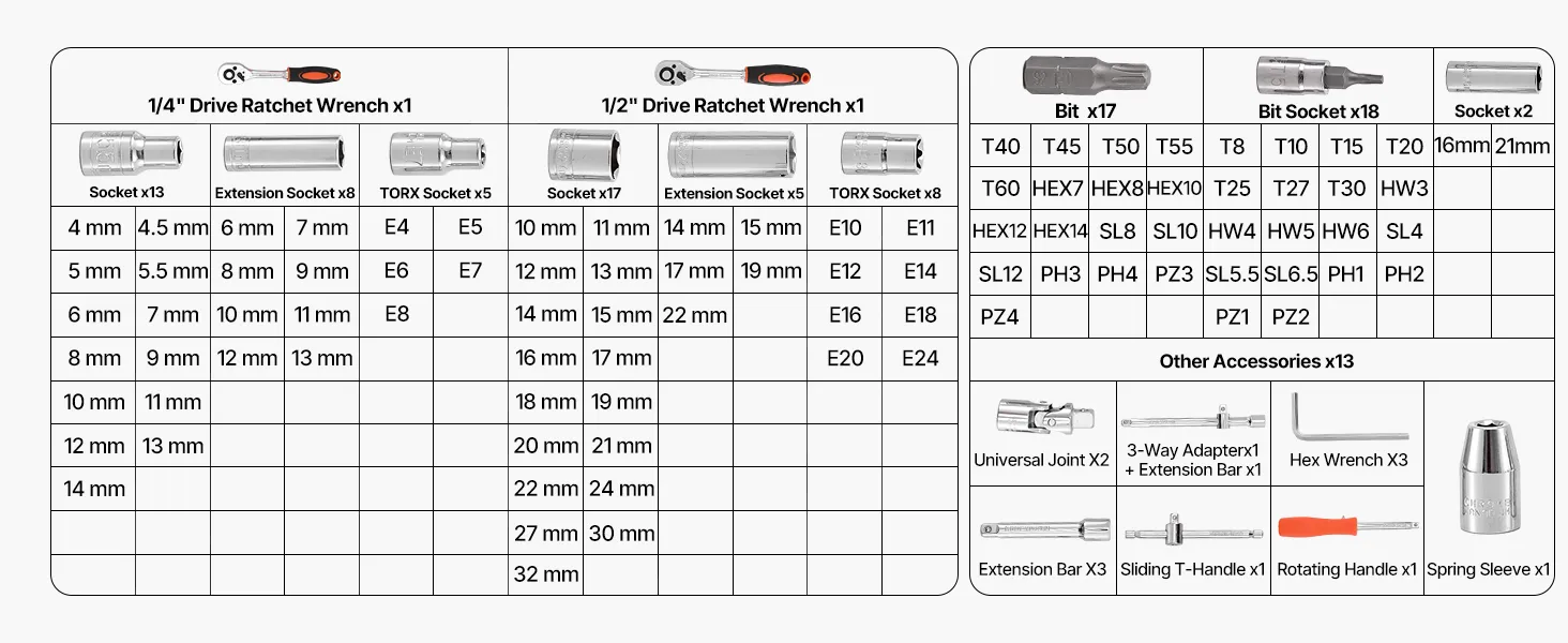 Convenient Storage Case: Our metric socket set comes with a durable, drop-resistant case with custom shockproof slots to keep tools secure. The reinforced latch design ensures secure storage, keeping tools organized and easy to access