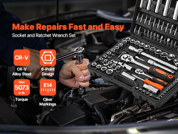 High Torque Design: Designed with a 6-point configuration, this socket and ratchet set evenly distributes pressure on fasteners to minimize wear. Its high-torque capability delivers up to 5073 IN-LB, easily handling rusted or tightly secured bolts