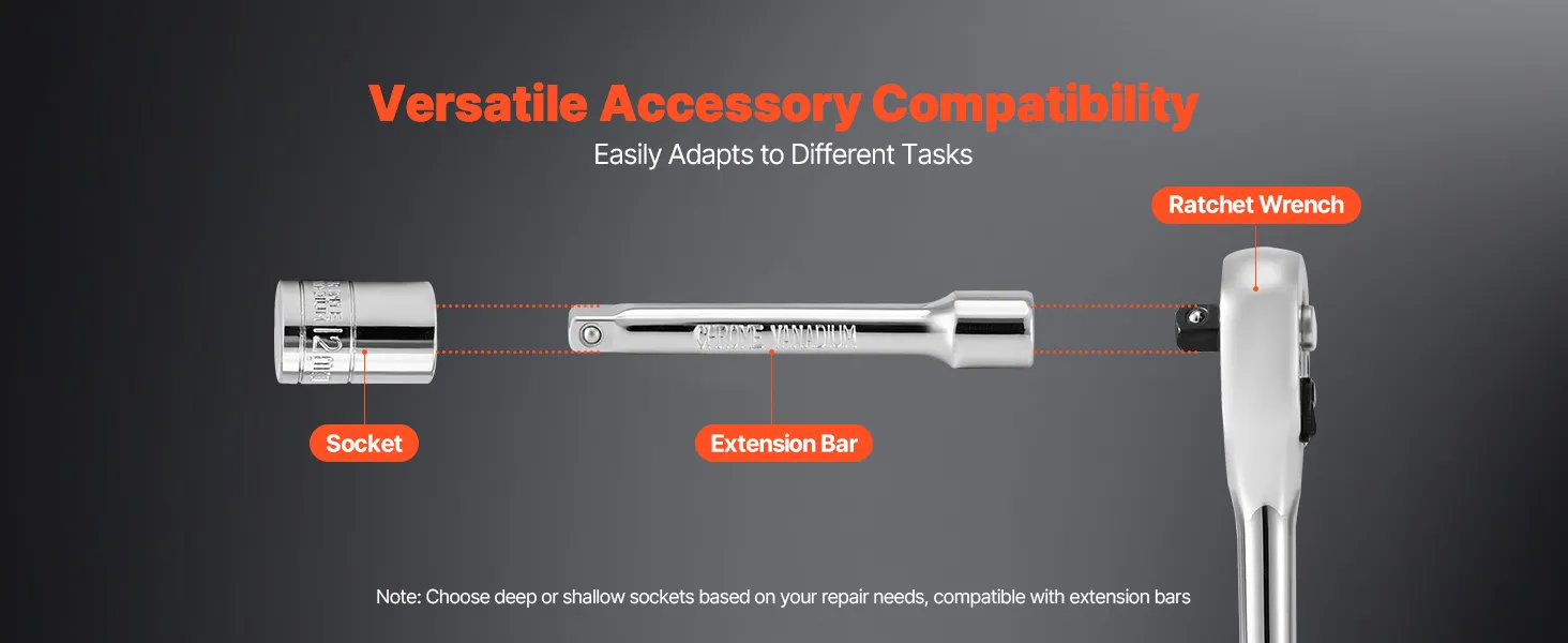 The precision socket and ratchet set works seamlessly with a variety of sockets and extension bars. Quick-release connections allow smooth switching between tools, significantly improving efficiency and convenience across different tasks.