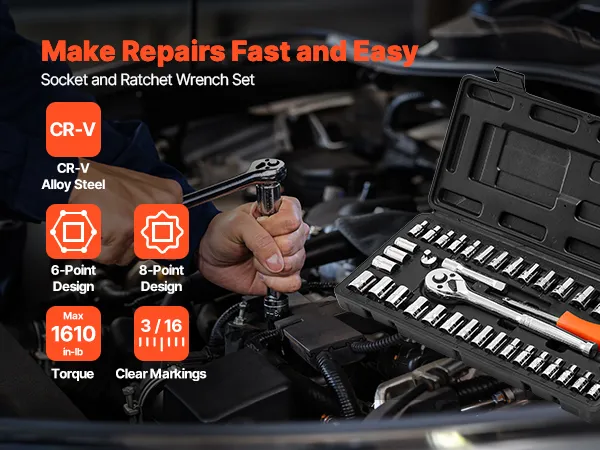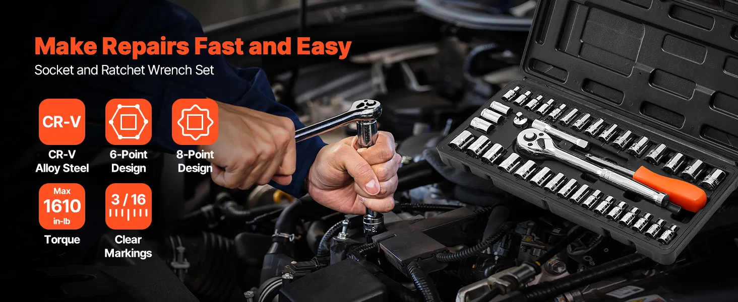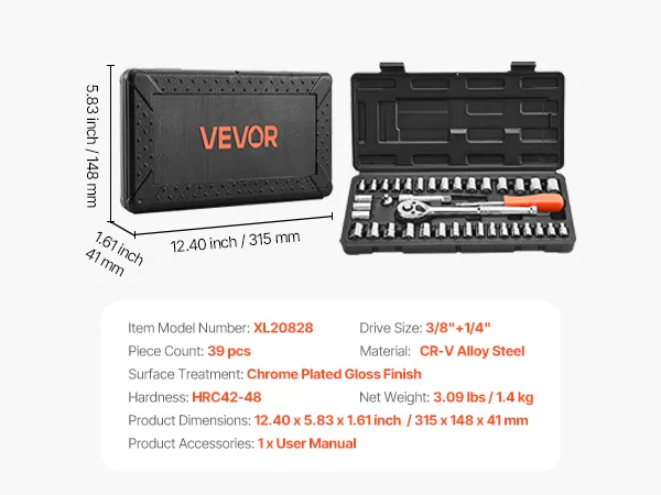VEVOR Socket Set, 39 Pieces, 9.5 & 6.4 mm Drive Socket and Ratchet Set, SAE and Metric Size, Mechanic Tool Kit with Ratchet Wrench, Accessories, Storage Case, CR-V Alloy Steel, for Automotive Repair VEVOR Socket Set, 39 Pieces, 9.5 & 6.4 mm Drive Socket and Ratchet Set, SAE and Metric Size, Mechanic Tool Kit with Ratchet Wrench, Accessories, Storage Case, CR-V Alloy Steel, for Automotive Repair