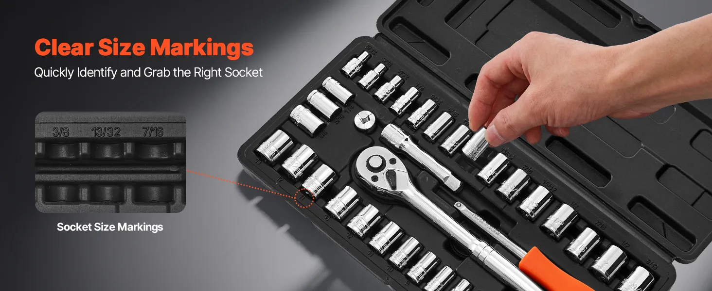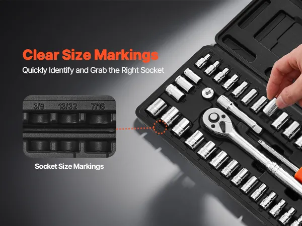Each socket features engraved, easy-to-read size markings that are highly wear-resistant. This socket tool set ensures quick identification and faster access to the right tool when you need it.