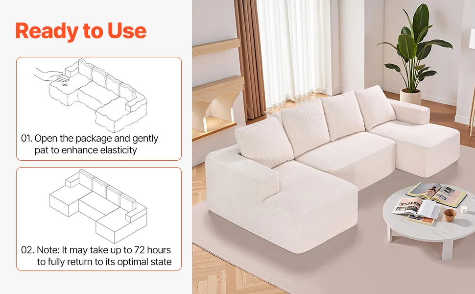 Just unpack, fluff up, and your modular sofa is ready to go! Give it 72 hours to fully expand and settle into its form.