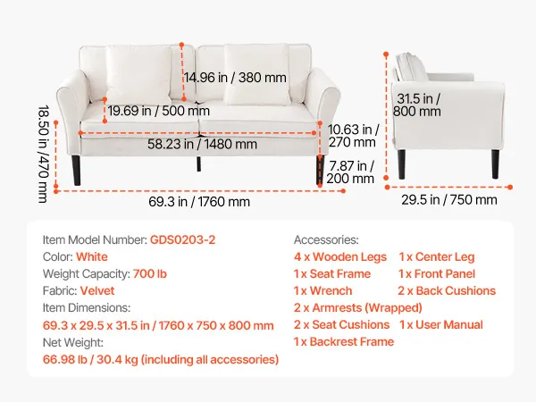Q: What are the exact dimensions? Will it fit in my bedroom or study? A: This petite sofa is designed for small spaces: overall length 69.3″, width 29.5″, height 31.5″, with a seat depth of 19.69″ and seat height of 18.5″. We've included a clear dimension diagram in the images so you can measure your space before ordering.