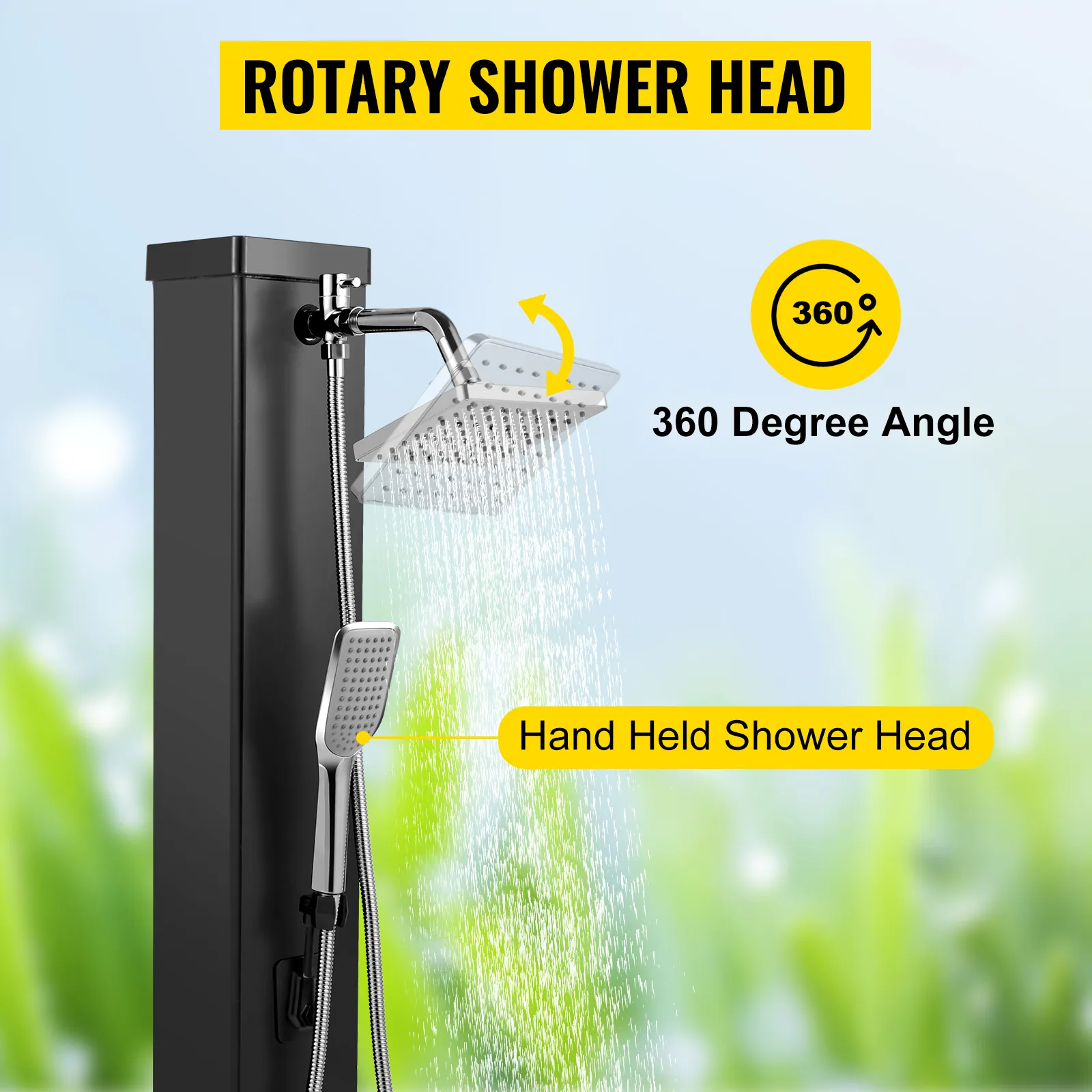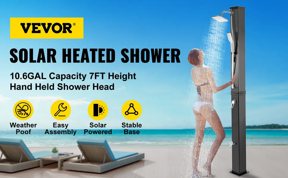 This outdoor solar shower is made of fast heat absorption PVC plastic, which is directly heated by solar energy and convenient for the outdoor shower. A stable screw base and chrome-plated faucet provide long-term use. Handheld showerhead and 360 degrees swivel shower head for your multi choices, enjoying a great outdoor shower experience. Suitable for backyard, a poolside spa, outdoor pool, garden, beach, etc.