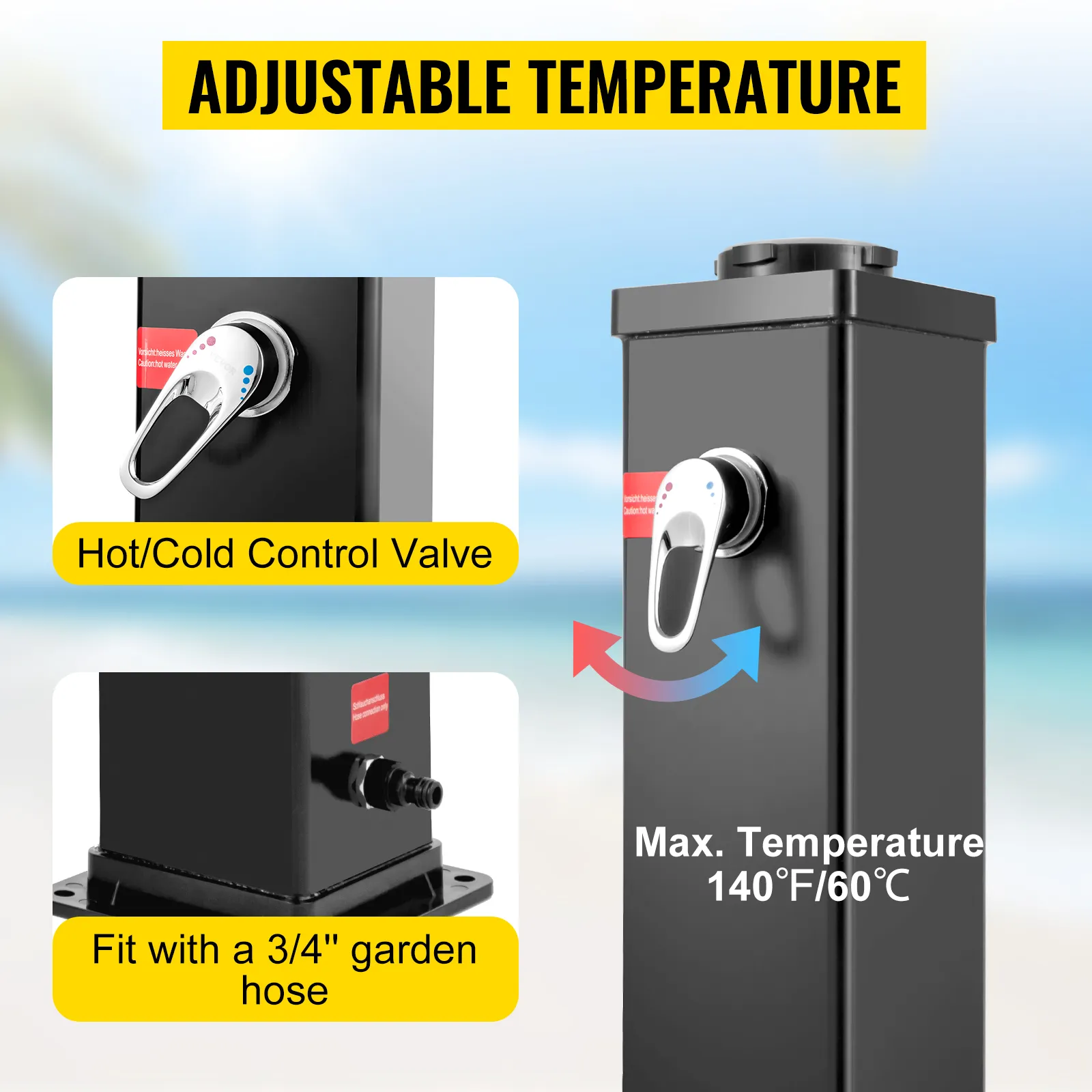 PVC plastic material shell features fast heat absorption. As a result, the temperature can go up to 140℉ under intense sunlight. And you can use the cold/hot water valve to adjust the water temperature. Note: Foot faucet only provides cold water.