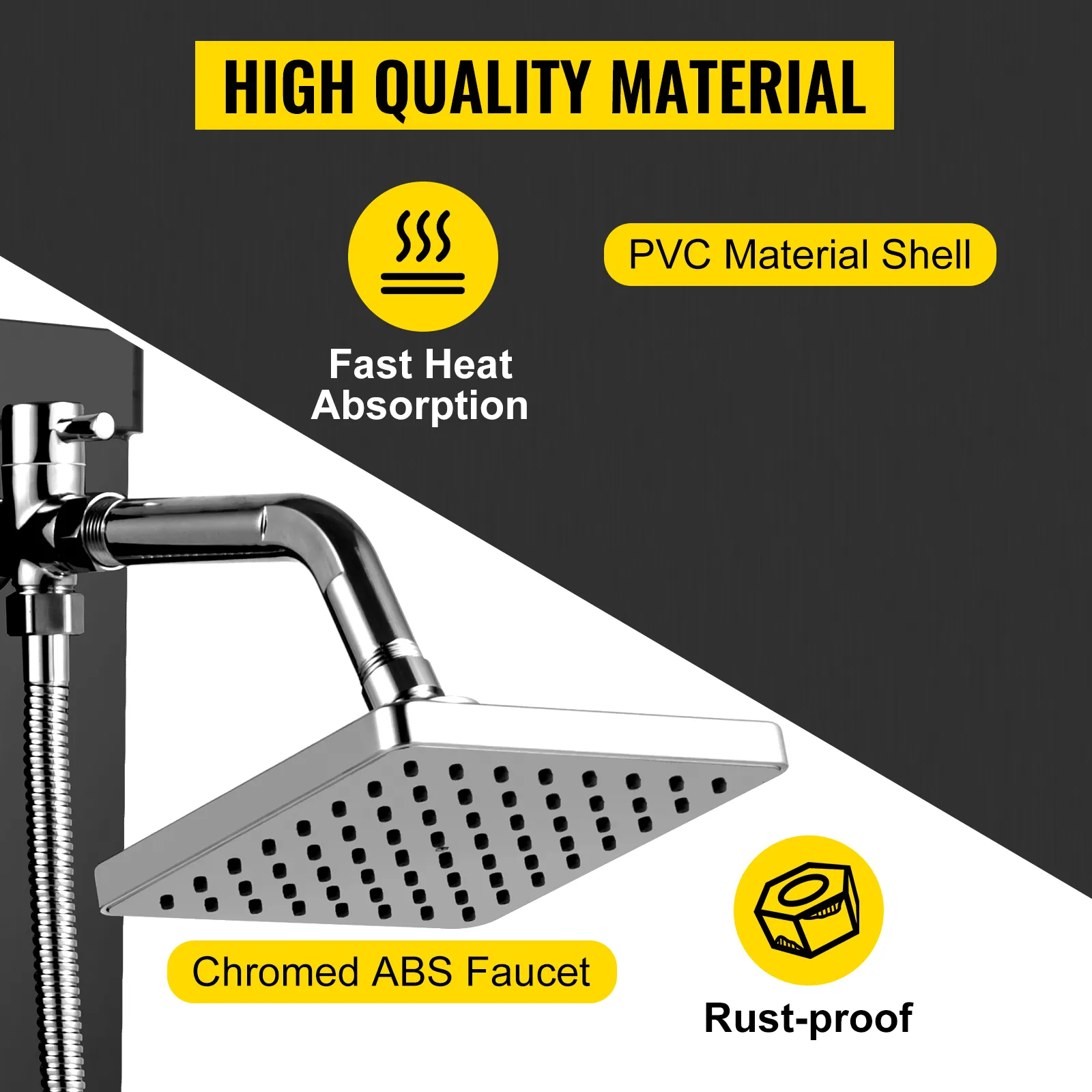 Our solar heated poolside shower is made of PVC plastic shell and chrome-plated ABS faucet, rust-proof, fast heat absorption, and durable for long-term use.