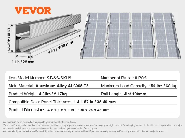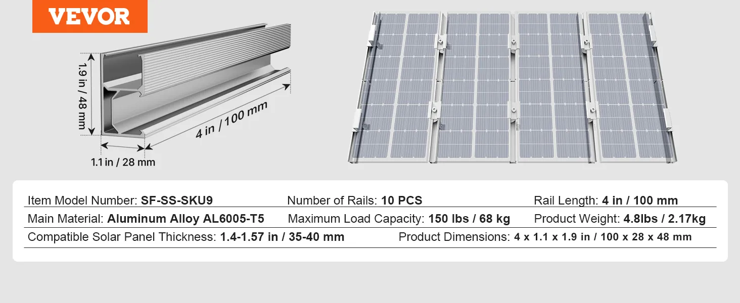 VEVOR Solar Panel Mounting Brackets, Solar Panel Mount Kit with 10 x 4" Mini Rails, 4 End Clamps and 6 Mild Clamps, Solar Panel Mount Brackets for Metal Roof, Concrete Roof, Wood Roof, Tile Roof