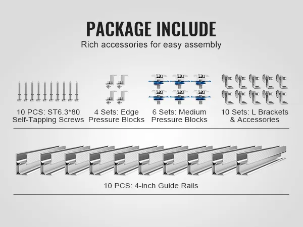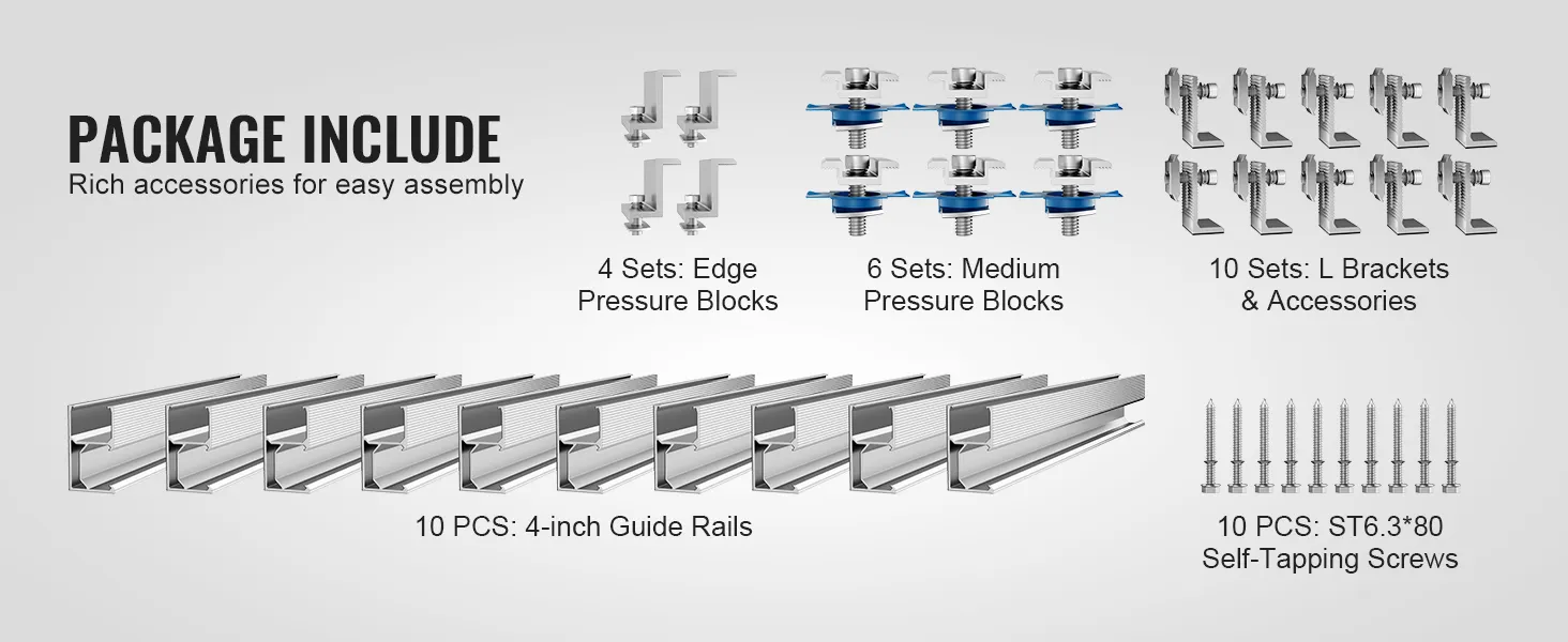 Our solar panel mounting system includes 10 guide rails (4-inch), 4 end clamps, 6 mild clamps,, and a set of accessories, providing stable mounting for your solar panels while enhancing overall stability and long-term performance.