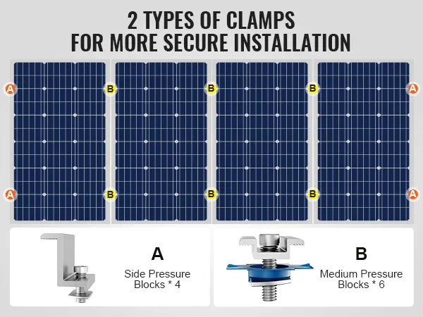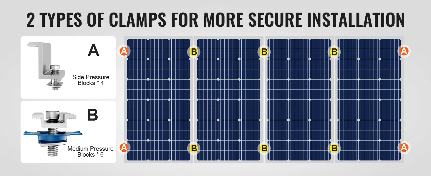 This mounting kit includes 2 types of clamps to ensure a more secure installation. 6 mid clamps secure adjacent panels together, and 4 end clamps provide additional support by securing the edges of the panels, ensuring your solar panel is firmly in place.