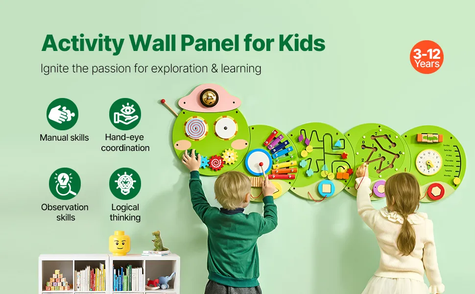 VEVOR Caterpillar Activity Wall Busy Board Panels, 12 Activities, Montessori Sensory Wall Toy for Kids 3-12 Years, Montessori Learning Activity Center, Ideal for Toddler Playroom Nursery Classroom