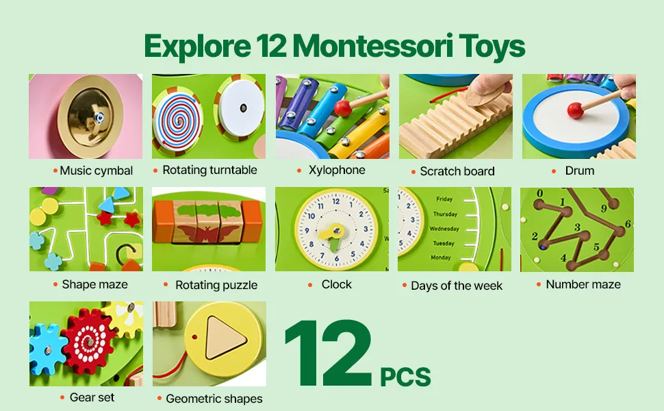 • Montessori Toy: This activity wall busy board, designed for kids 3-12 years, features 12 interactive games that turn any wall into an exciting play zone! With vibrant animal shapes and bright colors, it’ll quickly capture your child’s attention and encourage hours of educational fun.
