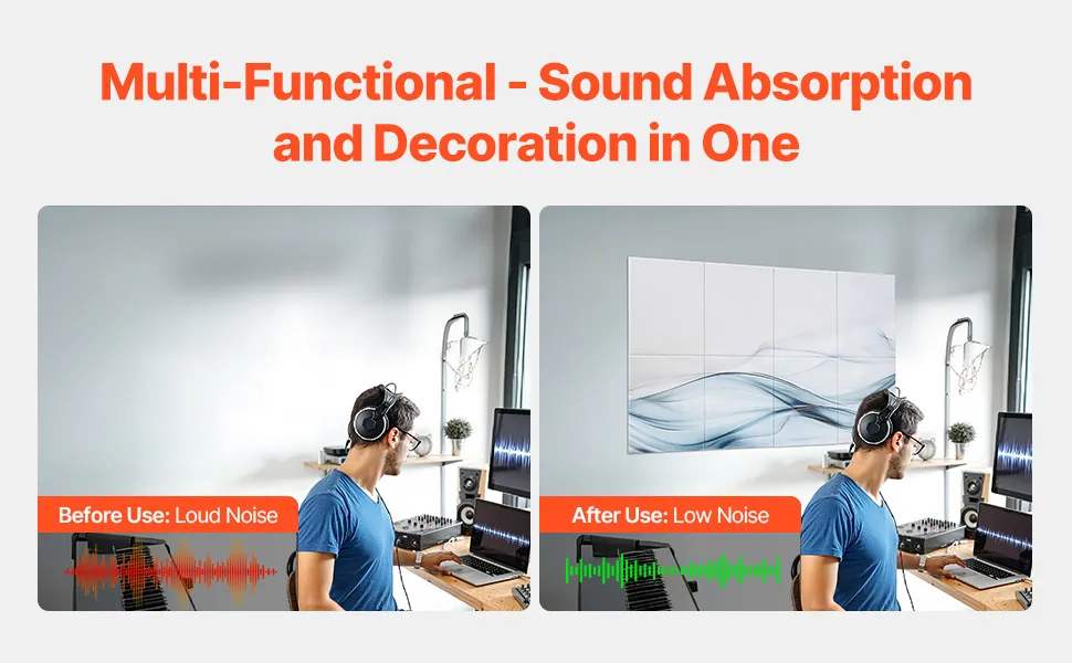 • Efficient Sound Absorption: Made with high-quality polyester fiber, our large-sized, high-density panels cover more area. With an NRC value of up to 1, they effectively absorb mid- to high-frequency noise, reduce echoes and reverberation, creating a quiet and comfortable environment for you