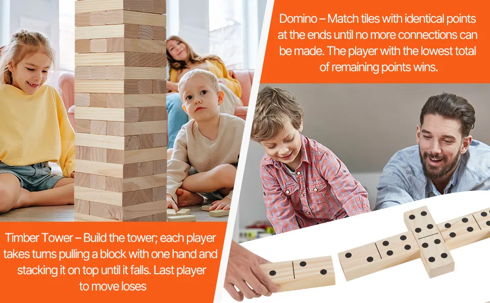 Multiple Ways to Play: The tumble timber set includes 54 blocks, with 28 featuring domino dots, allowing you to play both timber towers and dominoes. You can also customize the game by writing your own rules on the blank blocks, or even use them for doodling as decorative pieces.